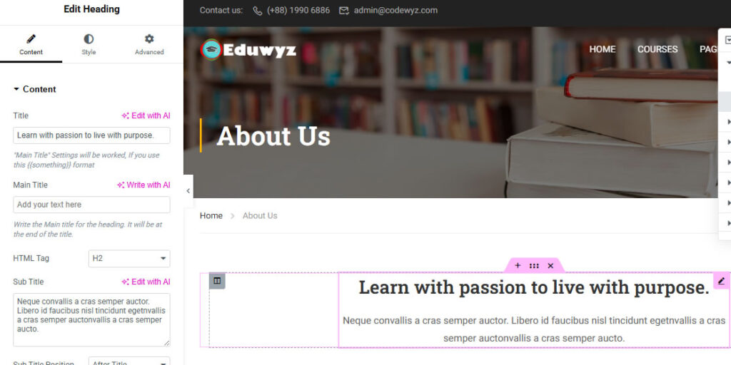 In this example, suppose we wanted to change the header “Learn with passion to live with purpose” one would click on it its corresponding setup panel will appear on the left plane of the Editor.